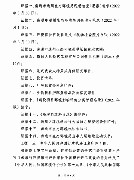 通06环罚字〔2022〕第125号 南通古风铁艺工程有限公司