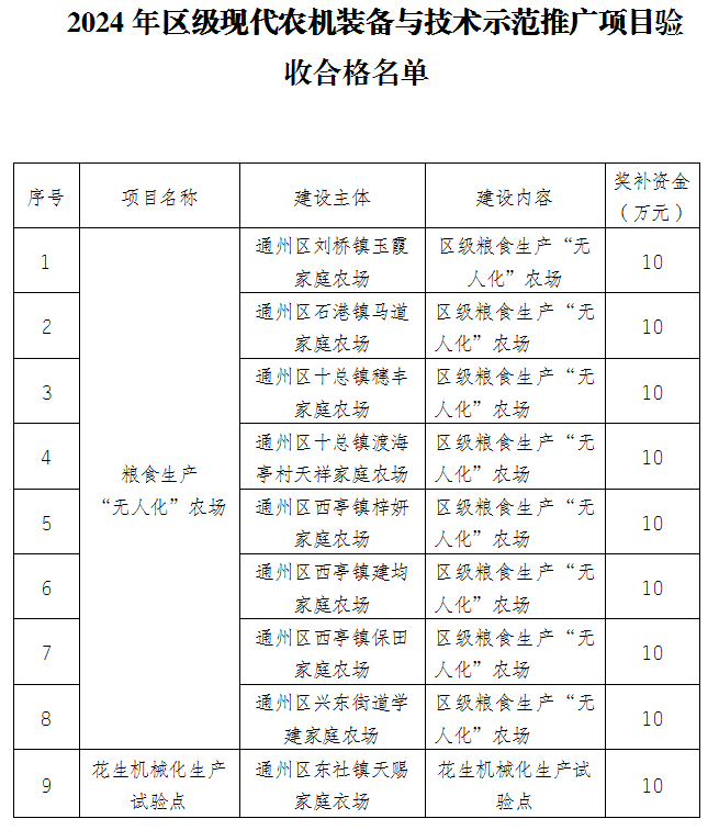 根据项目特点,通过专家验收的方式对区级粮食生产“无人化”农场、花生机械化生产试验点组织验收,现将验收合格的2024年度区级现代农机装备与技术示范推广项目主体名单予以公示。