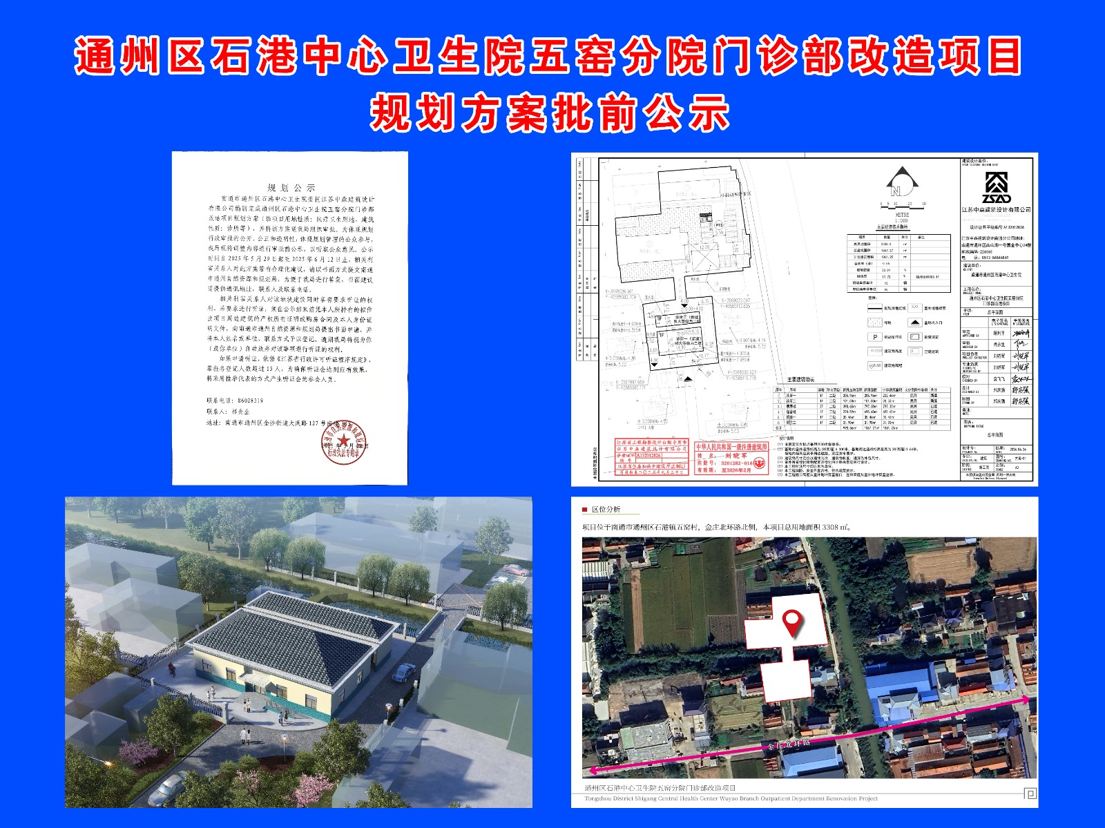 南通市通州区石港中心卫生院委托江苏中森建筑设计有限公司编制完成通州区石港中心卫生院五窑分院门诊部改造项目规划方案(该项目用地性质:医疗卫生用地,建筑性质:诊所等),并将该方案送我局组织审批。为体现规划行政审批的公开,公正和透明性,体现规划管理的公众参与,我局现将调整内容进行审批前公示,以听取公众意见。公示时间自2025年5月29日起至2025年6月12日止,相关利害关系人对此方案若有合理化建议,请以书面方式提交南通市通州自然资源和规划局,为便于我局进行答复,书面建议请提供通讯地址,联系人及联系电话。