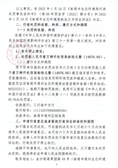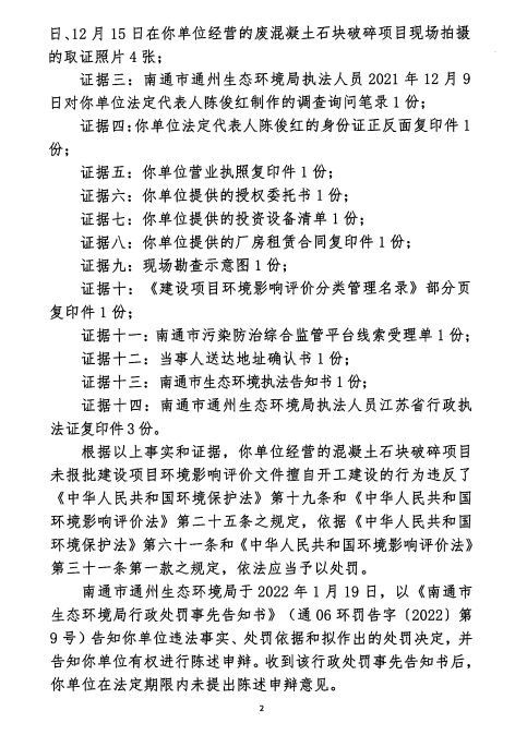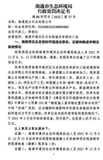 通06环罚字〔2022〕第77号 南通俊力石业有限公司