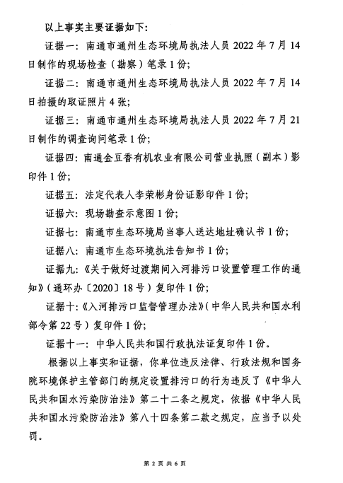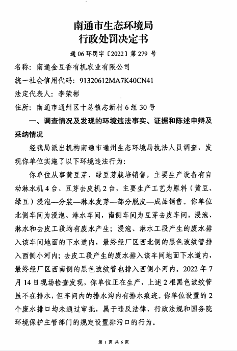 通06环罚字〔2022〕第279号 南通金豆香有机农业有限公司