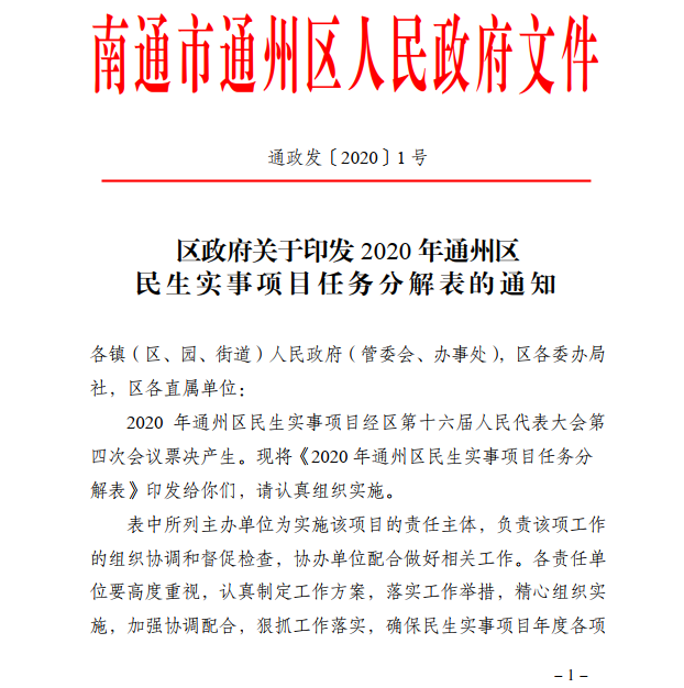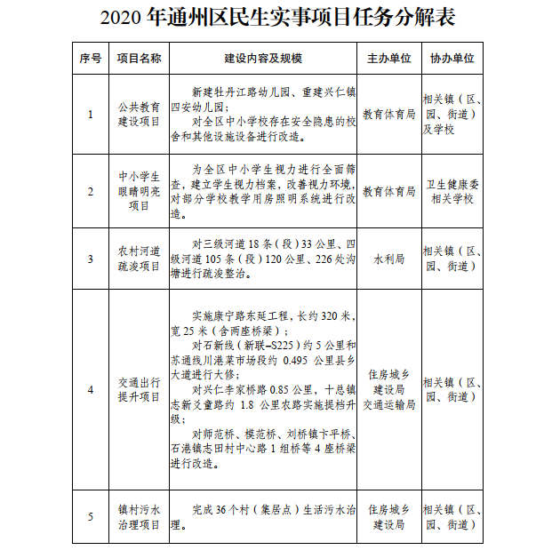 区政府关于印发2020年通州区民生实事项目任务分解表的通知