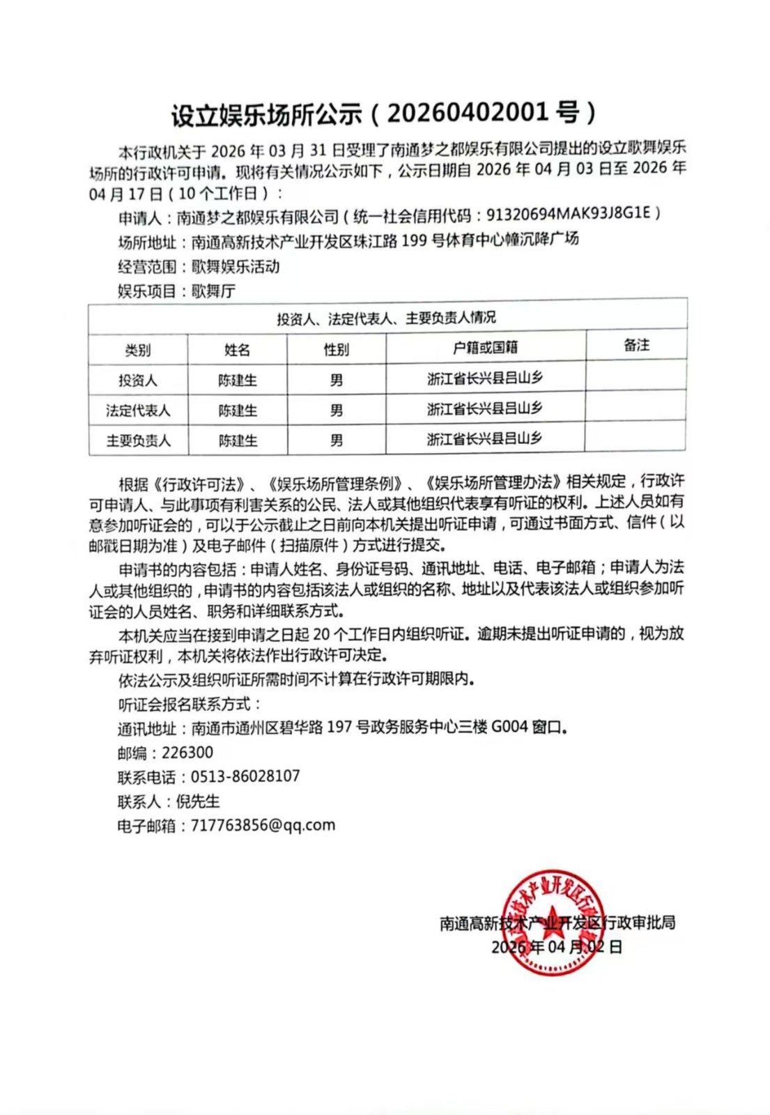 本行政机关于2026年03月31日受理了南通梦之都娱乐有限公司提出的设立歌舞娱乐场所的行政许可申请。现将有关情况公示如下,公示日期自2026年04月03日至2026年04月17日(10个工作日):