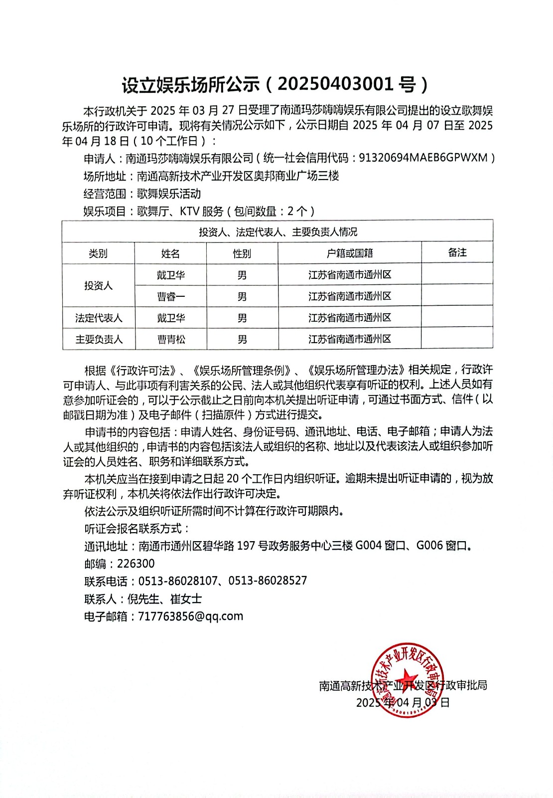 本行政机关于2025年03月27日受理了南通玛莎嗨嗨娱乐有限公司提出的设立歌舞娱乐场所的行政许可申请。现将有关情况公示如下,公示日期自2025年04月07日至2025年04月18日(10个工作日):